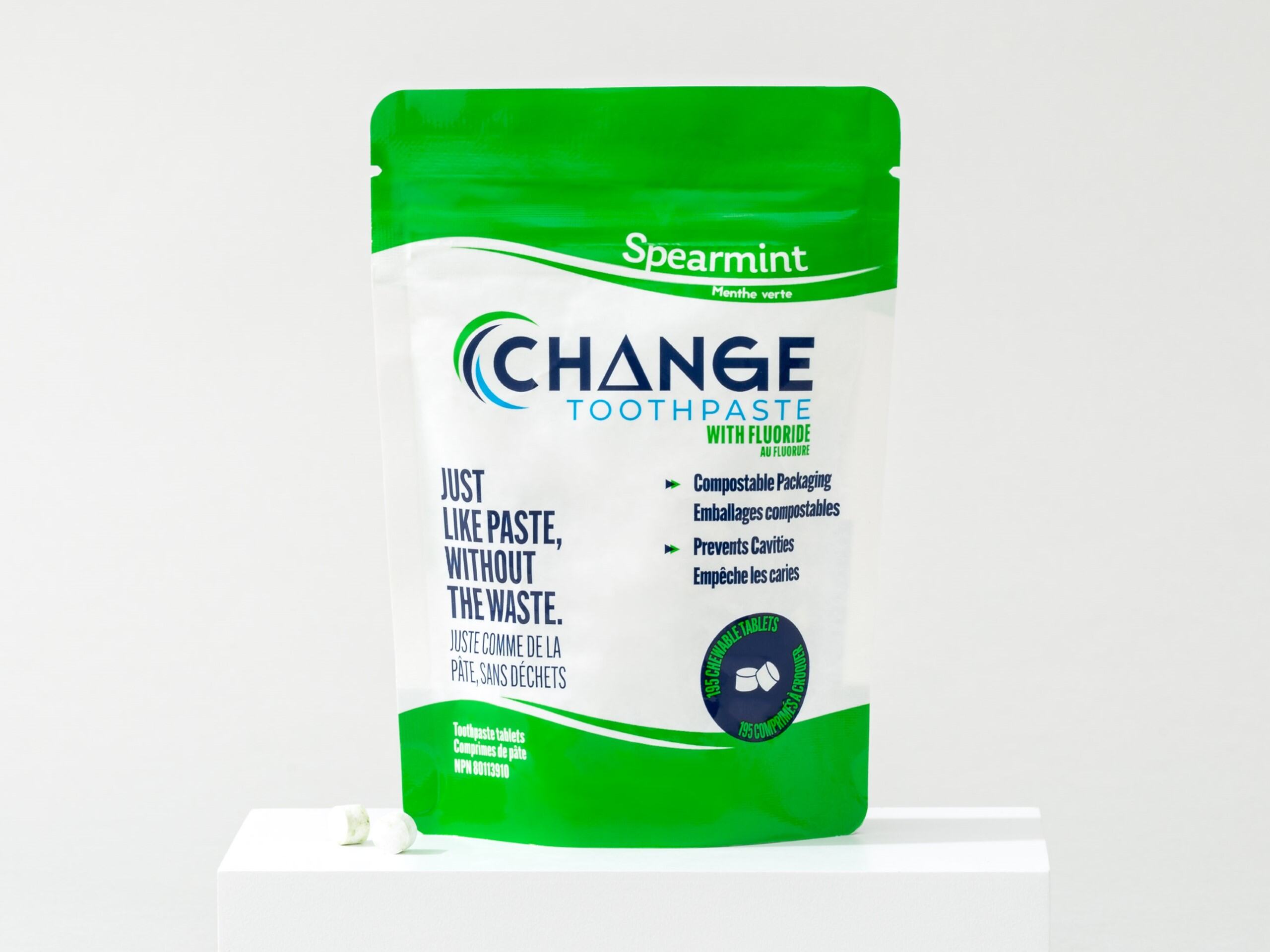 Découvrez notre dentifrice en pastille, en partenariat avec l'entreprise canadienne Change Toothpaste. Chaque sac contient 195 pastilles, disponibles dans une variété de saveurs : menthe, cannelle et gomme balloune. La version menthe offre également une option avec fluor pour une protection accrue contre les caries.